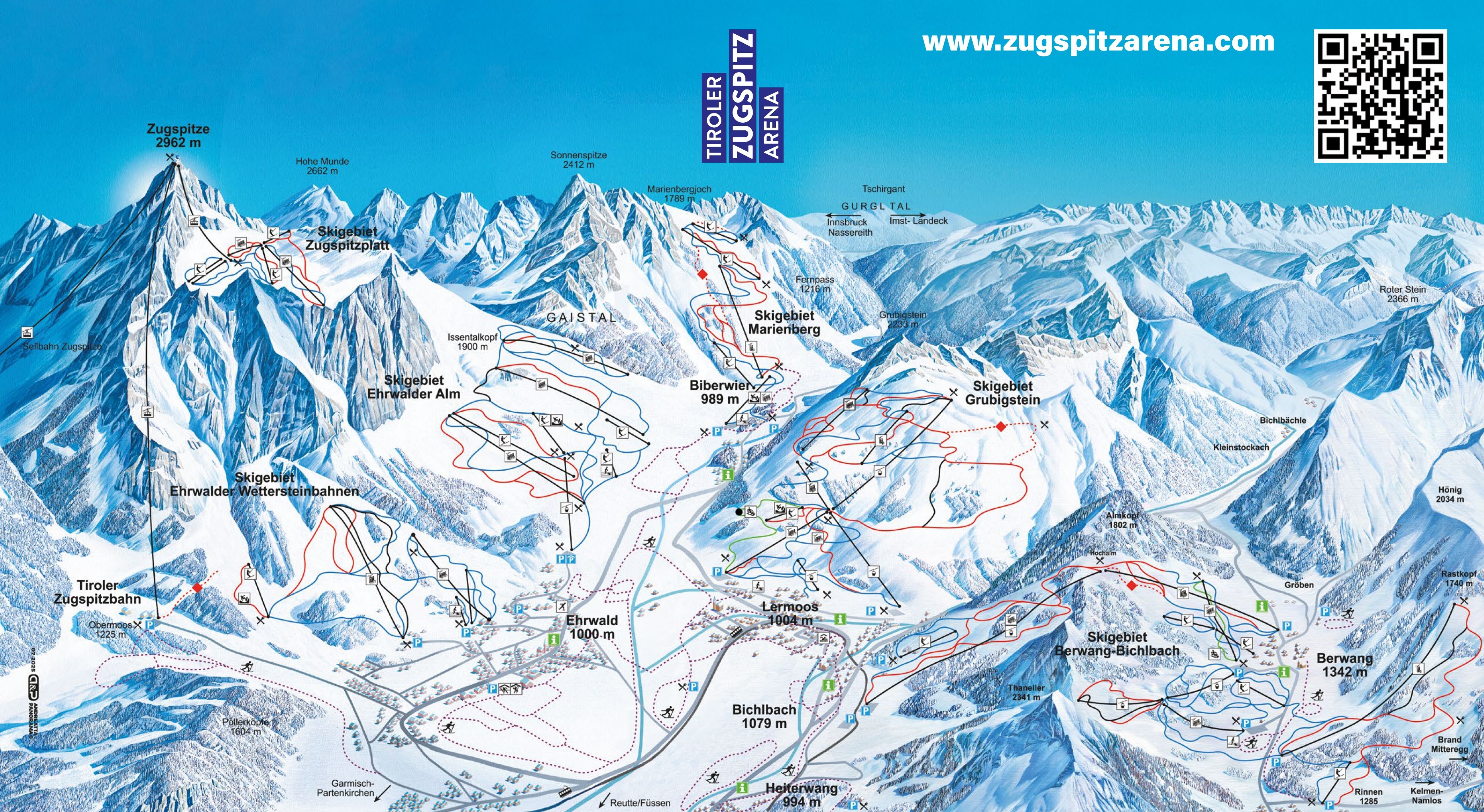 Het skigebied Zugspitz Arena heeft 144 kilometer piste en 55 liften verdeeld over zes afwisselende skigebieden. Wintersporters, families, wandelaars en langlaufers beleven een heerlijke vakantie met gepaste Tiroler charme. Van gletsjerskiën op de Zugspitzplatt tot de zonnige pistes van de Ehrwalder Alm en de Wettersteinbahn. In Berwang en Ehrwald vinden beginners en kinderen hun ideale pistes, en dat allemaal met één skipas.